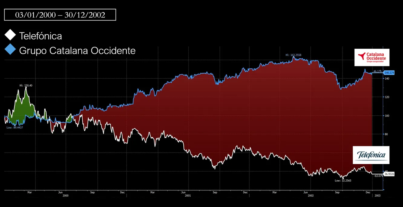 Observen en el siguiente gráfico lo que sucedió con un “darling” de la burbuja como Telefónica (línea blanca) y con una compañía de la “vieja economía” como la compañía de seguros Catalana Occidente (línea azul).