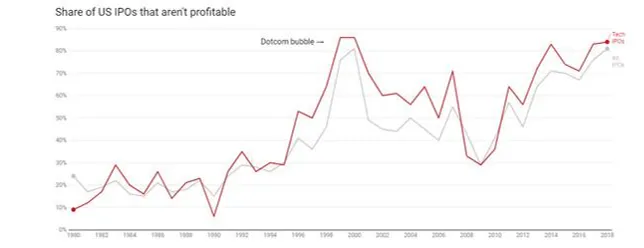- Compañías con seductores pero poco probados planes de negocio que están alcanzando valoraciones... absurdas (¿?). 2018 ha sido un récord de salidas a bolsa de compañías en pérdidas (alcanzando un 80% en algunos trimestres) desde la burbuja puntocom (ver gráfico abajo). Ejemplos como Beyond Meat, compañía que salió a cotizar en mayo de este año, ha subido un 550%, hoy capitaliza $14 mil millones y se estima que este año venda $240 millones (casi 60x ventas) y pierda dinero. La compañía fabrica y vende productos como hamburguesas con ingredientes vegetales. Juzguen ustedes mismos. O WeWork, Tesla, Uber, Crowdstrike...?