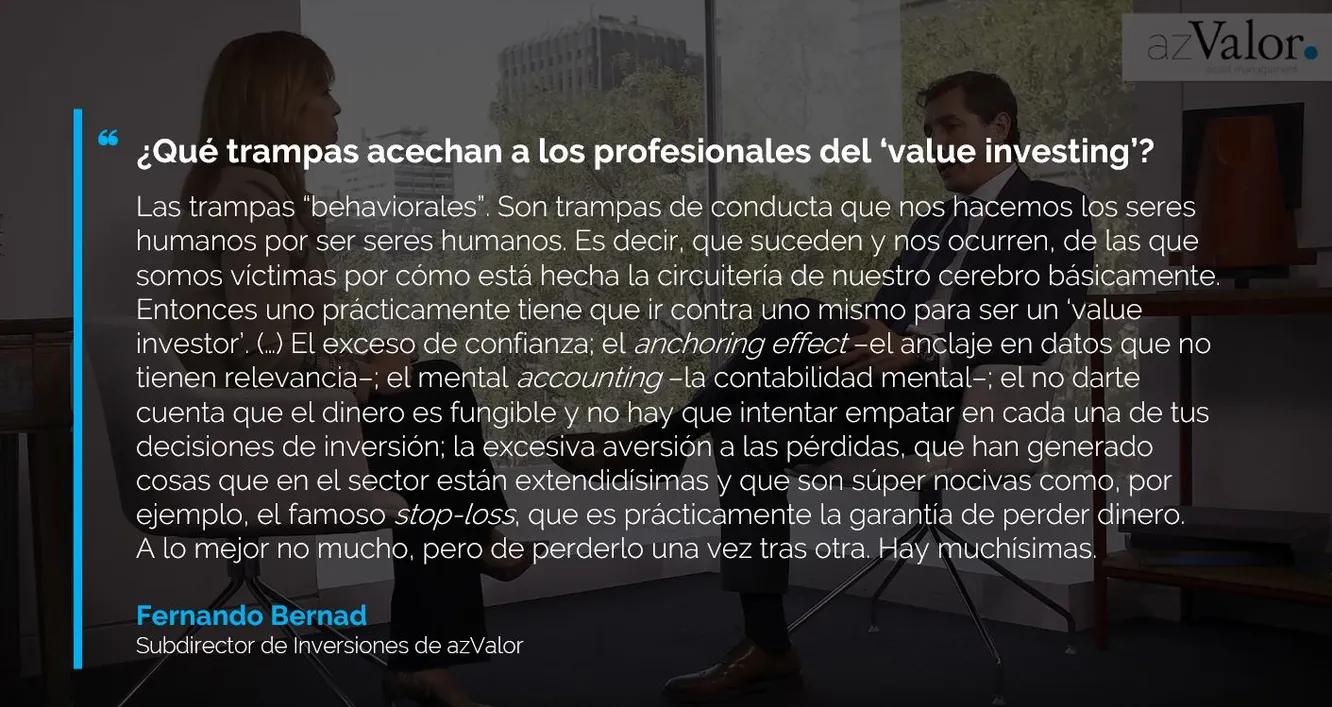 Fernando Bernad, Subdirector de Inversiones de azValor, nos lo explica: Las trampas “behaviorales” son trampas de conducta que nos hacemos los seres humanos por ser seres humanos. Es decir, que suceden y nos ocurren, de las que somos víctimas por cómo está hecha la circuitería de nuestro cerebro básicamente. Entonces uno prácticamente tiene que ir contra uno mismo para ser un value investor.