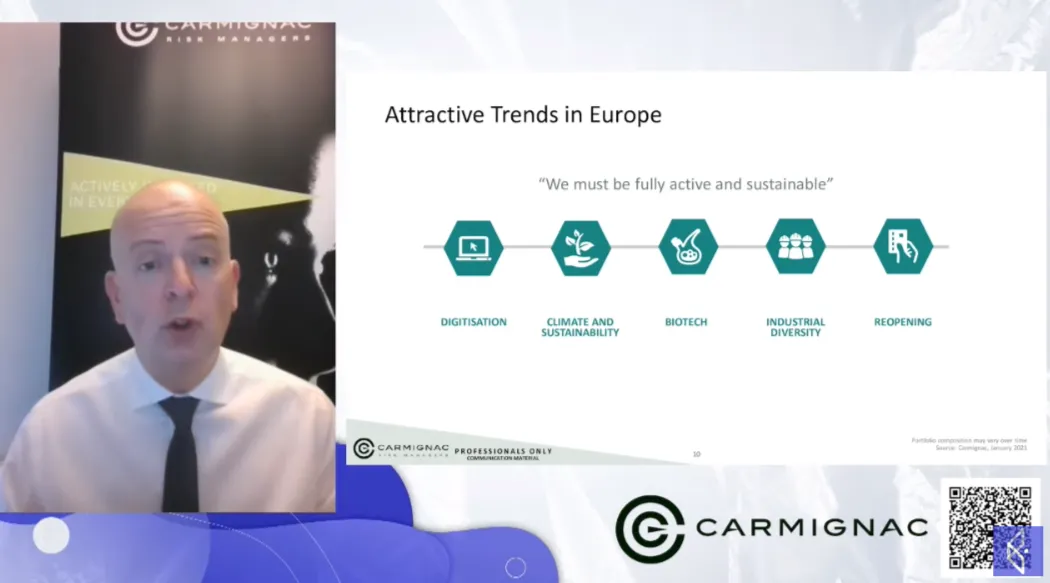 Desde el punto de vista de los sectores europeos que marcarán el futuro, Denham destacó la digitalización, una tendencia imparable en la que Europa está rezagada frente a Estados Unidos y, por tanto, ofrece grandes oportunidades a los inversores. En segundo lugar, el ámbito del cambio climático y la sostenibilidas es para Carmignac la otra línea de oportunidades para generar redimiento positivo (alfa) en las inversiones: "Sabemos que las renovables van a ser una megatendencia en las próximas décadas", ha declarado Denham. Finalmente, la biotecnología, la diversidad industrial europea y la reapertura de la economía son las otras tendencias que esconden opciones para el inversor.