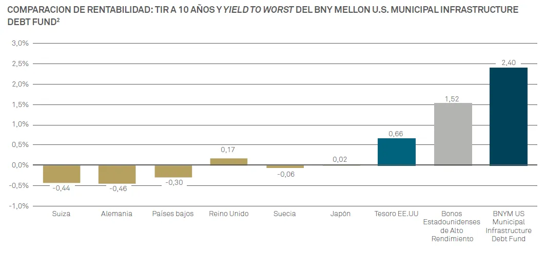 Desde una perspectiva de rentabilidad al vencimiento, tal como puede verse en el gráfico, el BNY Municipal Infrastructure Fund ofrece una TIR más alta que la de bonos corporativos de calificación similar, y considerablemente superior a la de la deuda pública estadounidense.