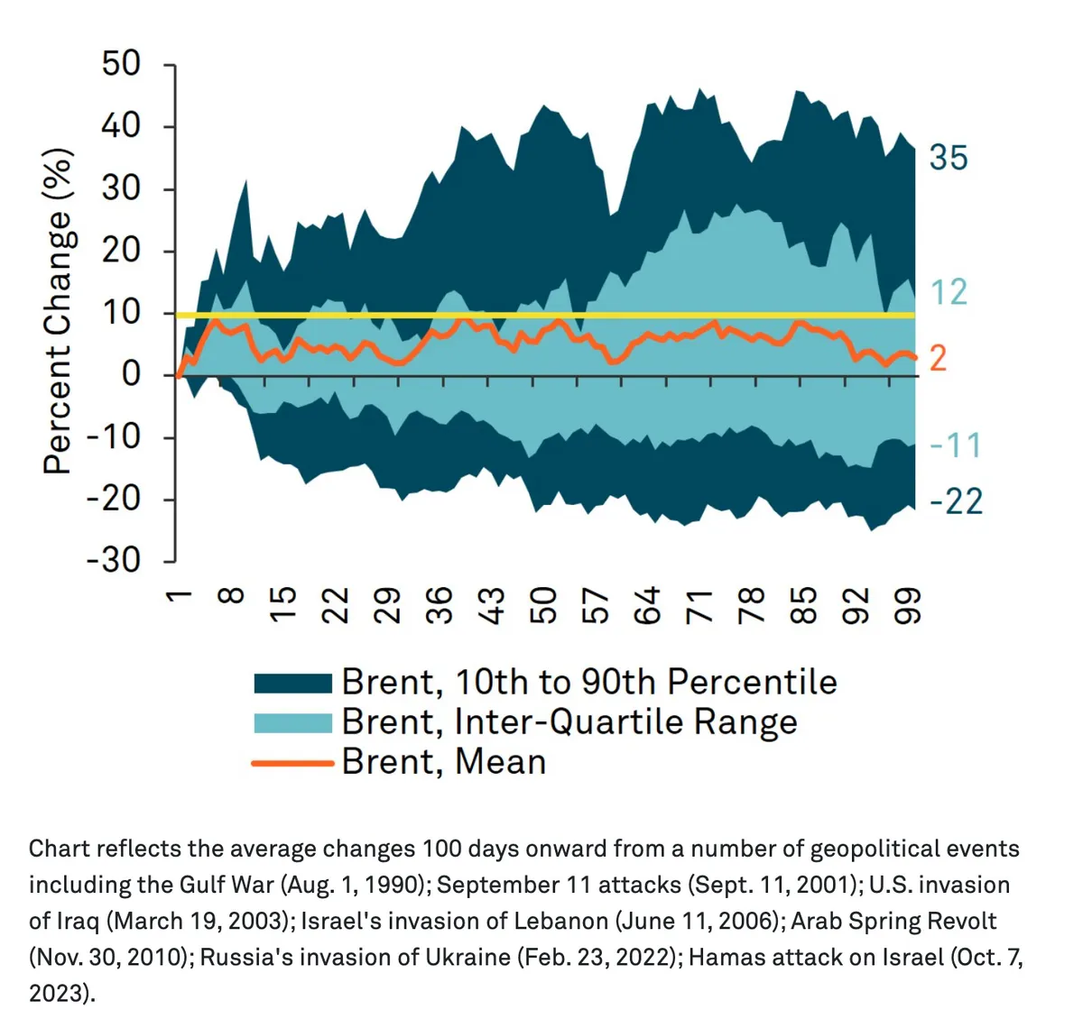 El gráfico refleja los cambios medios a partir de los 100 días derivados de varios eventos geopolíticos, incluyendo la Guerra del Golfo (1 de agosto de 1990); los atentados del 11 de septiembre (11 de septiembre de 2001); la invasión estadounidense de Irak (19 de marzo de 2003); la invasión israelí del Líbano (11 de junio de 2006); Revuelta de la Primavera Árabe (30 de noviembre de 2010); la invasión rusa de Ucrania (23 de febrero de 2022); Ataque de Hamás a Israel (7 de octubre de 2023).