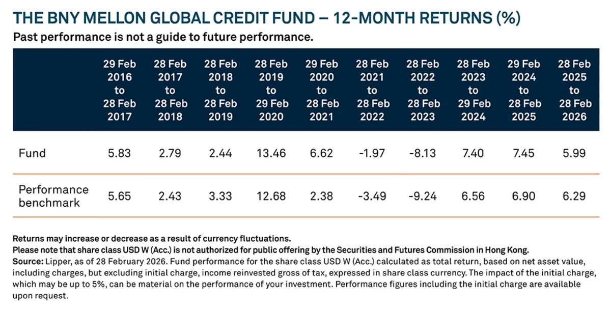 El Fondo BNY Mellon Global Credit se lanzó el 29 de febrero de 2016 y desde entonces ha alcanzado 3.500 millones de dólares en activos bajo gestión. En los últimos cinco años, el Fondo ha registrado un ratio de información de 0,78, una medida que lo sitúa en el percentil 5 del universo global de crédito con cobertura².