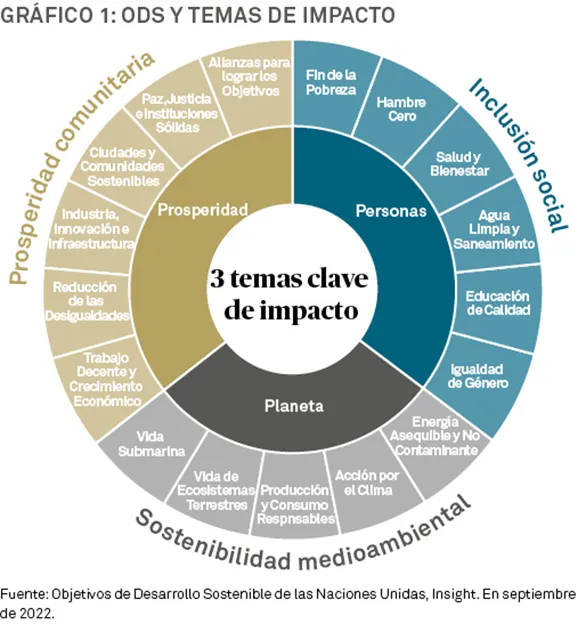 Un primer paso útil es definir qué entendemos por "impacto" o "resultados medioambientales y/o sociales positivos". En general, se considera que los 17 Objetivos de Desarrollo Sostenible (ODS) de las Naciones Unidas reflejan el marco estándar del sector para definir el impacto. Insight cree que pueden agruparse en tres subconjuntos de objetivos: orientados a las personas, orientados al planeta y orientados a la prosperidad. Puede considerarse que estos tres grupos reflejan temas de impacto clave.