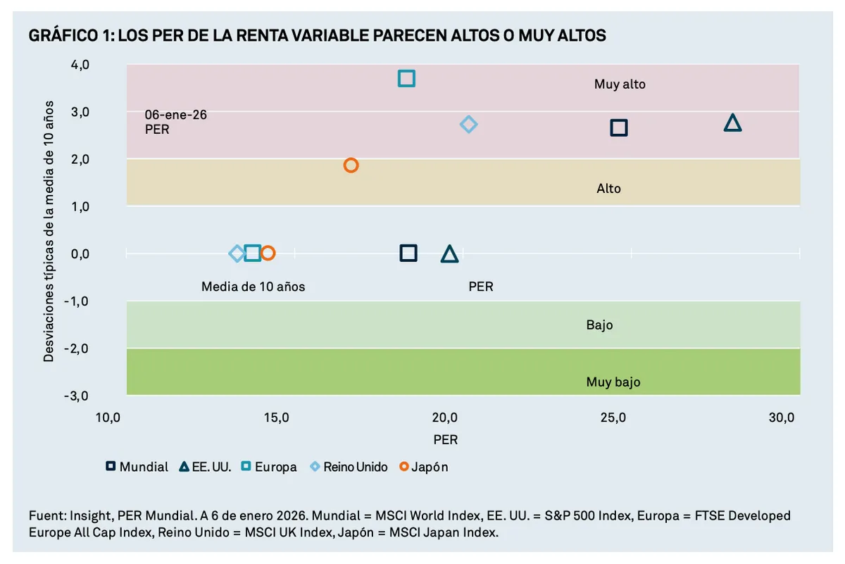 A medida que los inversores evalúan las oportunidades en los mercados mundiales, muchos se muestran preocupados por los posibles rendimientos y la volatilidad asociados a la renta variable. El gráfico 1 muestra los ratios precio/beneficio (PER) a nivel de país frente a sus medias de 10 años, con la mayoría de los principales mercados en niveles muy altos en relación con los datos históricos.