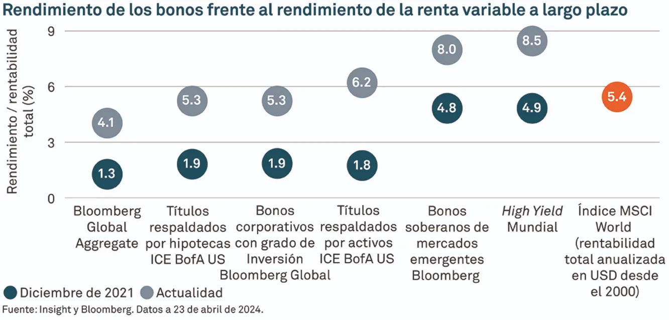 4 Fuente: Insight y Bloomberg. Índice Bloomberg Global High Yield e índice MSCI World (rendimiento total), datos entre el 31 de enero de 1990 y el 30 de abril de 2024