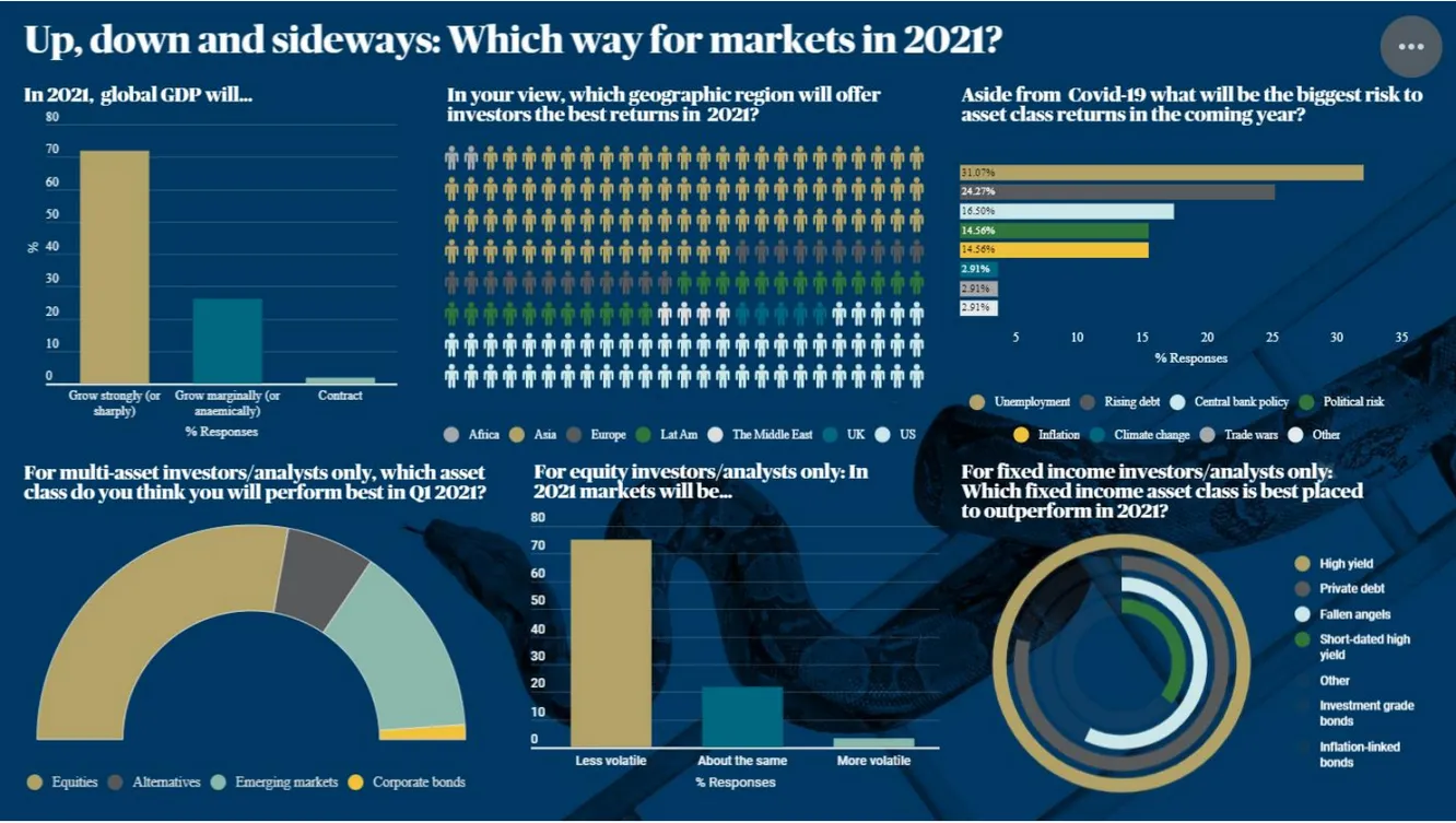 Más del 70% de los encuestados dijeron que esperan que el PIB mundial crezca mucho o fuertemente en 2021, y otro 27% dijo que cree que el PIB crecerá marginalmente. Sólo el 3% de los encuestados dijo que creía que la economía se contraerá este año. Teniendo en cuenta esta respuesta, quizás no sorprenda que casi la mitad de los analistas dijeron que se posicionarían de forma más agresiva este año frente al pasado, con sólo un 11% que dijo que adoptaría una postura más defensiva en su enfoque de inversión.