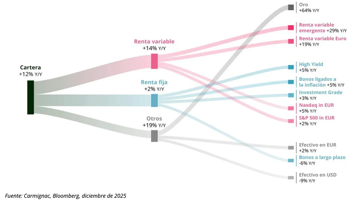El gráfico siguiente muestra la evolución de una cartera multiactivos invertida a partes iguales en renta variable europea, renta variable de mercados emergentes, renta variable estadounidense y renta variable tecnológica en euros, crédito investment grade y high yield, bonos a largo plazo, bonos indexados a la inflación, oro, efectivo en euros y efectivo en dólares estadounidenses1 en 2025.