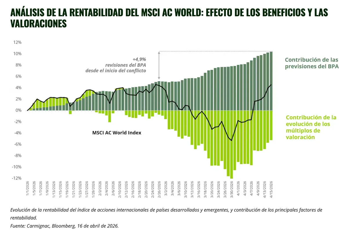 El análisis de los factores que determinan la rentabilidad de los principales índices mundiales ayuda a entender esta aparente paradoja. Los múltiplos de valoración no han respaldado los mercados, ya que, en general, se han reducido. Los dividendos apenas han desempeñado un papel marginal. Así pues, es el efecto de los resultados, la dinámica de los beneficios, lo que explica el repunte de los mercados. Desde que empezó el conflicto con Irán, las previsiones de crecimiento de los resultados para 2026 se han revisado al alza en más de un 4%, lo que sitúa el índice bursátil mundial en torno a un +20% en el conjunto año.¹ Esto explica la solidez de los mercados a pesar de las incertidumbres. Estas expectativas positivas sobre los resultados contrastan con un entorno más difícil: condiciones financieras más restrictivas, subida de los tipos de interés debido a una mayor inflación, ralentización de la actividad, presiones sobre los costes y unos márgenes que ya se acercan a sus máximos.