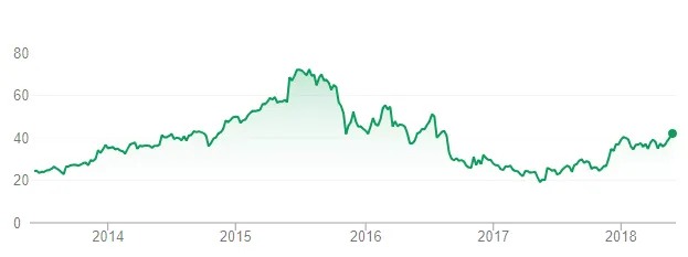 Se trata de una compañía con un market cap de aproximadamente 2.335Mn$ cuya evolución en bolsa durante los últimos años mostramos a continuación: