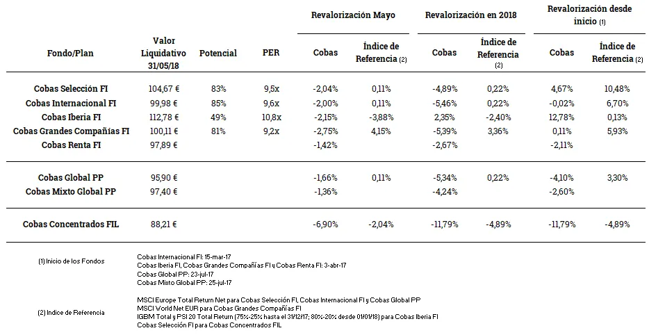 A continuación, ponemos a su disposición la ficha mensual de cada uno de los fondos de inversión de Cobas Asset Management correspondientes al mes de mayo. Puede acceder a ellas haciendo clic en los siguientes enlaces: