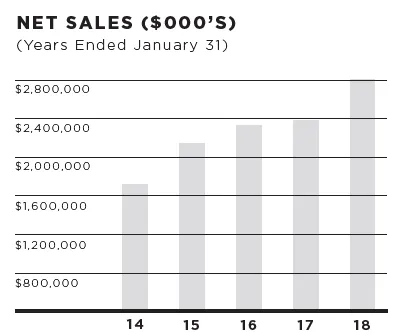 Así mismo, hay que destacar que la compañía cuenta con un portfolio de producto muy amplio, el cual cubre muchas escalas de precio y se sirve a través de múltiples canales de distribución, lo que le permite llegar a un gran número de público objetivo y le otorga la flexibilidad suficiente para poder adaptarse a un entorno cambiante como el de la moda. Además de vender sus productos a través de diversos retailers como por ejemplo Macy’s, G-III cuenta con su propio canal de distribución minorista, a la vez que está aumentando las ventas online a través de plataformas como Amazon o Fanatics.