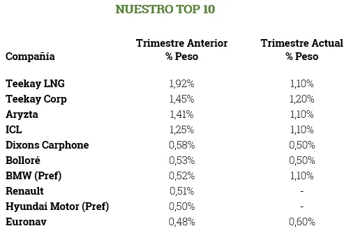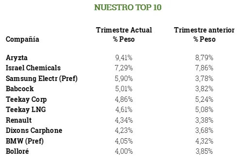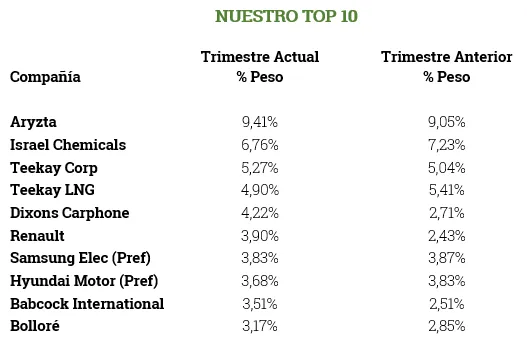 Los pesos de los valores principales de la cartera no han sufrido cambios importantes, siendo Aryzta, el grupo Teekay e ICL las tres inversiones más significativas, con un peso de alrededor del 25% entre las tres.