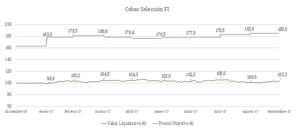 El valor objetivo del fondo Cobas Selección se sitúa en 185 euros/participación, muy por encima del valor liquidativo y con un potencial de revalorización superior al 80%. Hemos seguido incrementado el valor de la cartera durante el trimestre y esperamos que ello se vaya reflejando a lo largo del tiempo en su valor liquidativo.