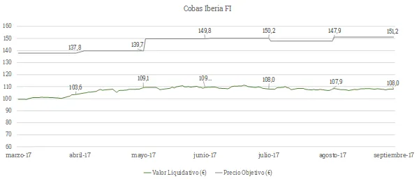 El valor objetivo del fondo Cobas Iberia se sitúa muy por encima del valor liquidativo, 151,2 euros/participación, con un potencial de revalorización cercano al 40%. Hemos seguido incrementado el valor de la cartera durante el trimestre y esperamos que ello se vaya reflejando a lo largo del tiempo en su valor liquidativo.