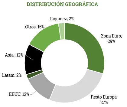La distribución geográfica tampoco ha cambiado significativamente durante el trimestre manteniendo una fuerte exposición fuera de Europa y de la zona Euro, que aunque nos perjudique a corto plazo por la fortaleza del euro, nos dará rentabilidades atractivas en el futuro.