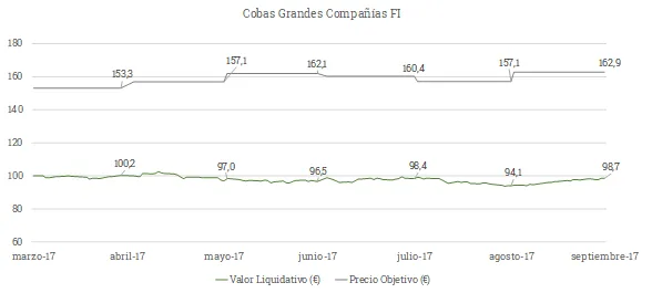 El valor objetivo de la cartera de Cobas Grandes Compañías, 162,9 euros/participación, se sitúa muy por encima del valor liquidativo con un potencial de revalorización superior al 65%. Hemos seguido incrementando el valor de la cartera durante el trimestre, que es la esencia de nuestro trabajo, y esperamos que ello se vaya reflejando a lo largo del tiempo en su valor liquidativo.