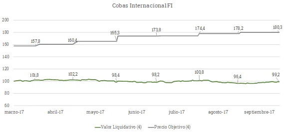 El valor objetivo de la cartera de Cobas Internacional, 180€/participación, se sitúa muy por encima del valor liquidativo con un potencial de revalorización superior al 80%. Hemos seguido incrementando el valor de la cartera durante el trimestre, que es la esencia de nuestro trabajo, y esperamos que ello se vaya reflejando a lo largo del tiempo en su valor liquidativo.