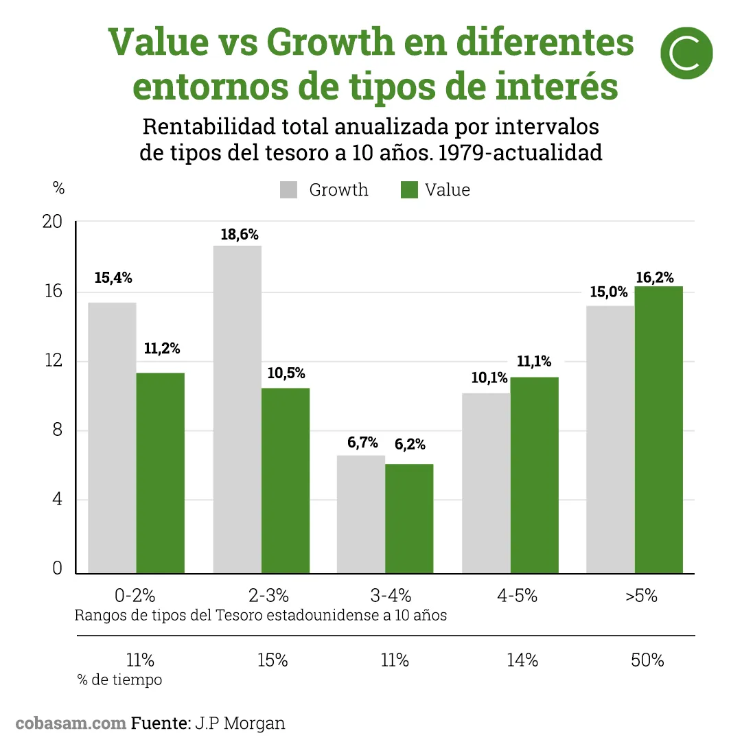 Las acciones value se han comportado peor que las acciones growth en los últimos años, de hecho desde hace mucho tiempo las acciones value no se encontraban tan baratas comparadas con las growth. En el siguiente gráfico de JPMorgan se muestra como se comportan ambas estrategias inversoras ante diferentes entornos de tipos de interés. Podemos concluir que en entornos de tipos de interés más elevados, históricamente las acciones value se han comportado mejor.