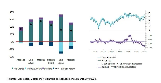 Gráficos 2 y 3: Rentabilidad de 2019 desglosada desde la perspectiva de la GBP (eje izdo.); PER a un año absoluto y relativo