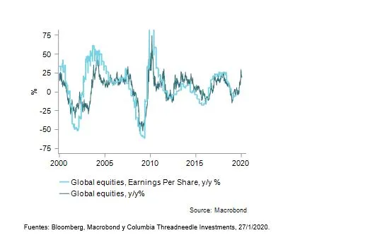 Cómo cambian las cosas en un año. Tras un traumático 2018, el año pasado permitió a los inversores capturar la segunda mejor rentabilidad de los últimos 30 años con una combinación de valores de renta fija mundial y bonos a largo plazo. Respecto a la Renta Variable, también fue un año de expansión sin precedentes de las rentabilidades, superada solo una vez desde las postrimerías de los años 80, en 2009, cuando los mercados se hallaban en plena recuperación tras la devastadora crisis financiera. Por consiguiente, en 2020, los beneficios tendrán que transformarse en precios para que el avance tenga potencial (gráfico 1).