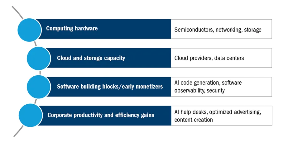 Narang: El ritmo de innovación de las compañías que operan en el segmento de la IA es impresionante. Estamos asistiendo a un flujo más acelerado de nuevos productos, lo que se traduce en mejores productos para los usuarios finales. Por ejemplo, Microsoft ha lanzado varios copilotos de IA que ayudan a mejorar la productividad en el proceso de codificación. Las compañías también recurren a la IA en otros segmentos, como los de atención al cliente, servicio de asistencia informática, creación de contenido, detección de fraudes, optimización de las cadenas de suministro y mantenimiento predictivo.