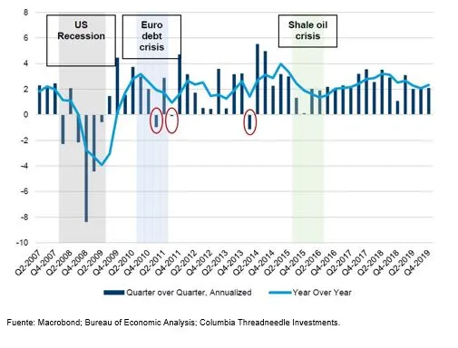 En la actual expansión (la más larga que se recuerda), se han dado tres ejemplos de crecimiento trimestral de signo negativo. Y, aun así, la economía ha proseguido su dilatada trayectoria alcista.