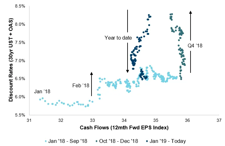Entonces, ¿qué está pasando? Si bien las expectativas de beneficios son, a todas luces, inferiores a las de hace un año, también son menores los tipos a los que se descuentan los beneficios futuros. Obsérvese el gráfico 2, que ilustra las expectativas de beneficios de la renta variable mundial a lo largo del eje X, frente a un análisis heurístico de los tipos de descuento mundiales (rendimientos estadounidenses de larga duración con un riesgo de diferencial ajustado a la opción en el eje Y. Entre enero y septiembre del año pasado, los tipos de descuento exhibieron un errático movimiento lateral, con un salto en torno al mes de febrero, mientras que las expectativas de beneficios continuaron evolucionando favorablemente. No obstante, a partir de octubre, los flujos de efectivo tan solo descendieron ligeramente, mientras que los tipos de descuento se dispararon (en casi 200 p.b.) hasta el mes de diciembre. Este año los flujos de efectivo muestran un deterioro más visible, los tipos de descuento han sufrido una caída mucho más significativa y los mercados se han anotado un fuerte repunte.