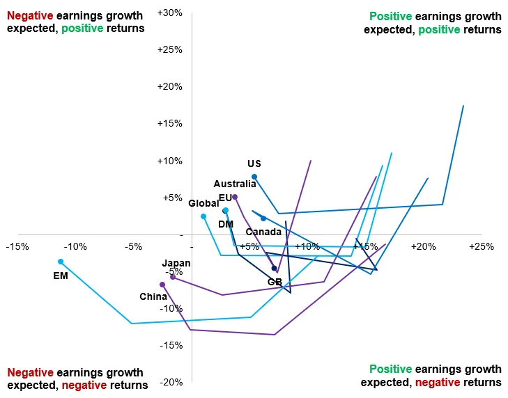 Los flujos de efectivo y los tipos de descuento han descrito trayectorias opuestas en los seis últimos meses —y los movimientos de los tipos de descuento se han llevado la palma. Echemos un vistazo a lo que va de año. Los flujos de efectivo para los accionistas (equity cash flows), cuyo indicador son las expectativas de crecimiento de los beneficios, se han debilitado en todas las regiones o bloques de renta variable principales, con un movimiento horizontal hacia la izquierda como se observa en el gráfico 1. Ahora bien, las rentabilidades de los mercados bursátiles han aumentado (desplazamiento vertical), ignorando aparentemente el deterioro de los flujos de caja.