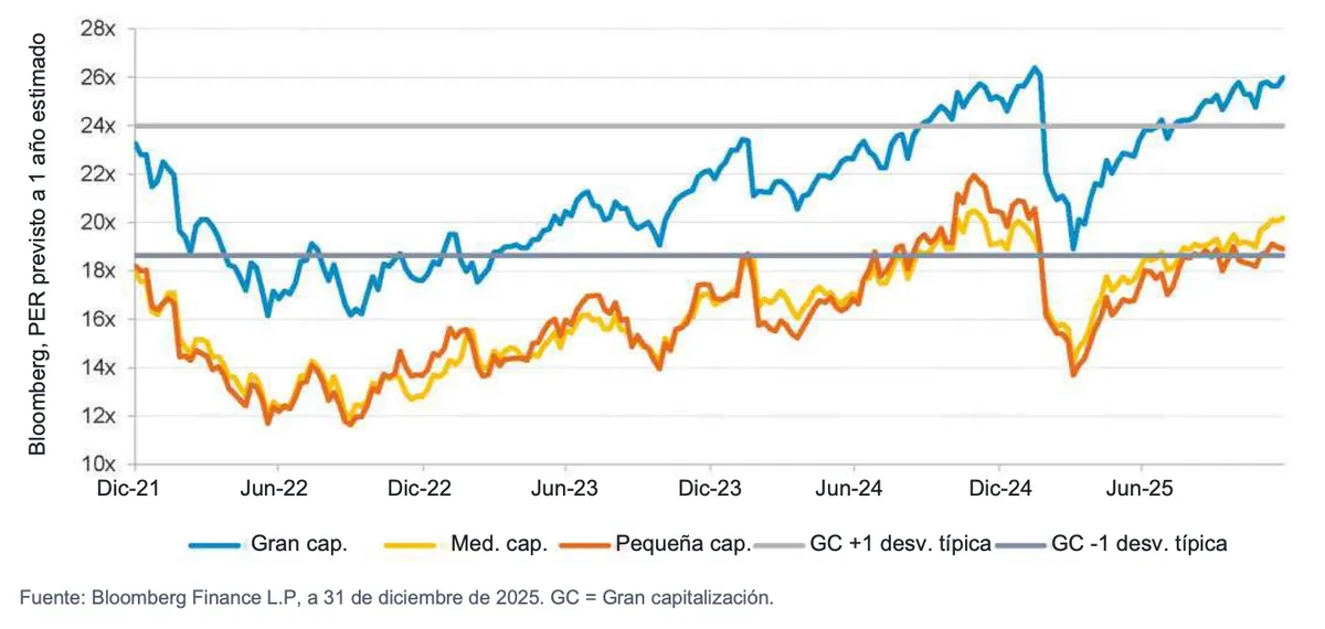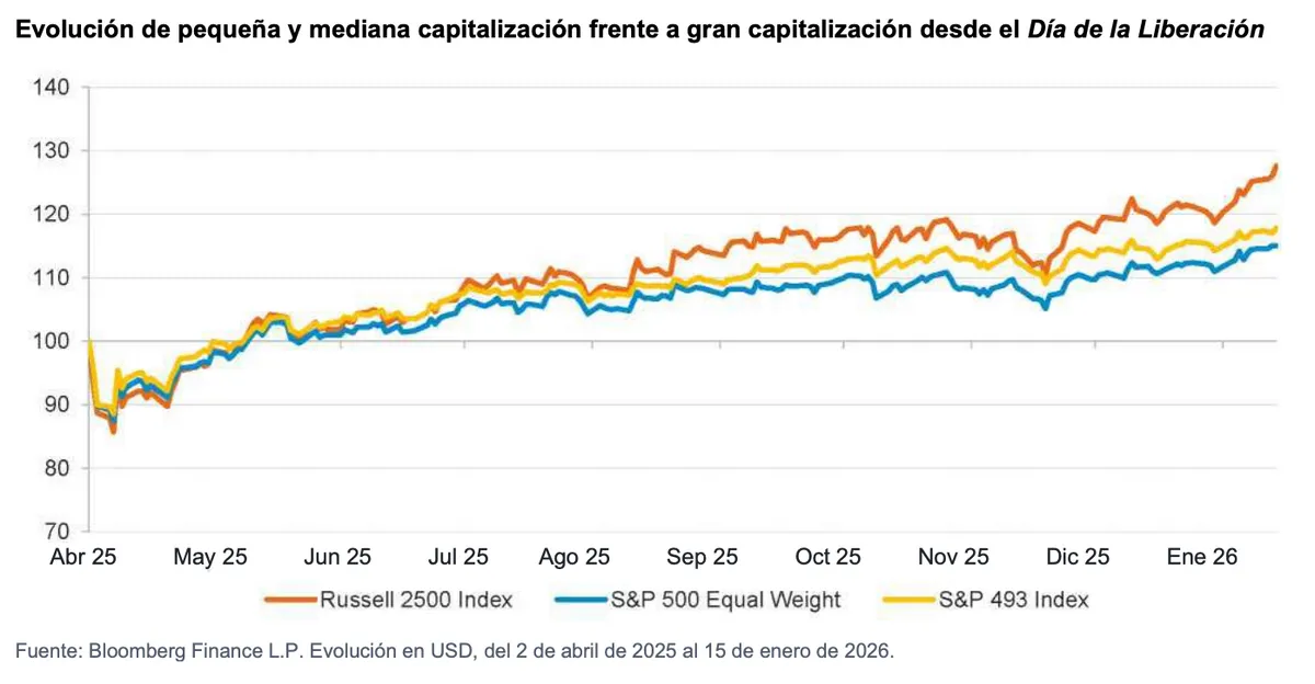 Un aspecto importante es que las tendencias han comenzado a invertirse: después de cuatro años de mal comportamiento relativo, los valores pequeños y medianos comenzaron a recuperarse en 2025 gracias a la relajación de las condiciones financieras y la mejora de las dinámicas de beneficios.