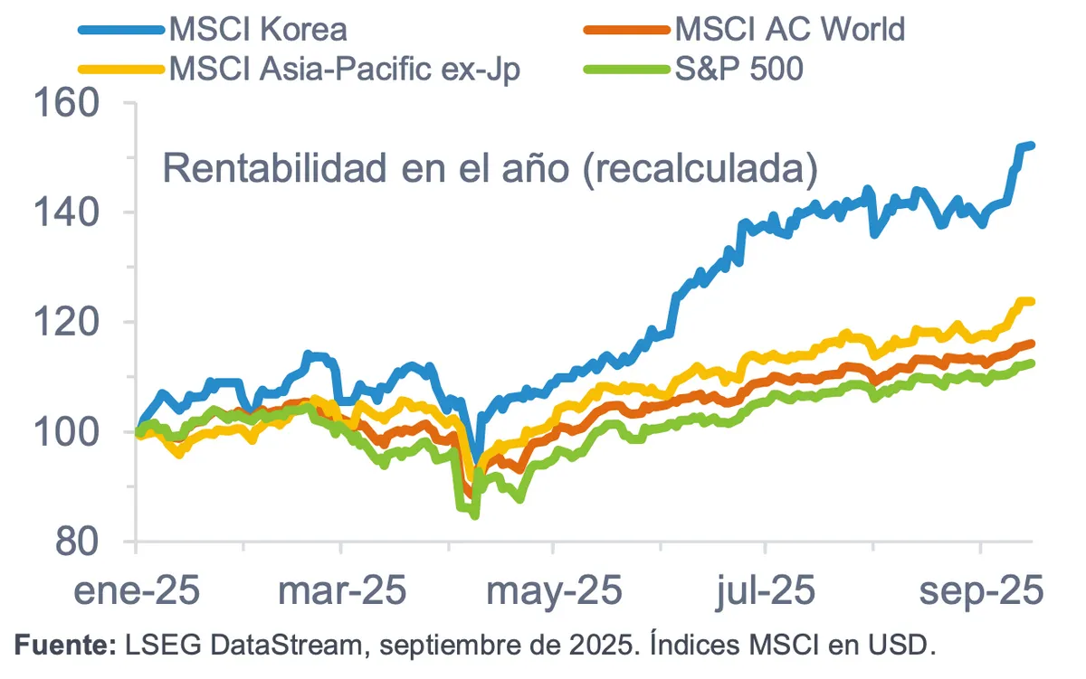 - Tras varias reformas del gobierno corporativo, las acciones coreanas se han disparado un 62% este año, batiendo tanto a la región de Asia-Pacífico menos Japón como al S&P 500. Esta tendencia podría persistir.
