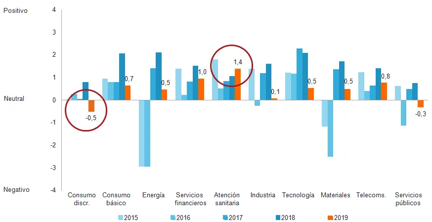 El sector sanitario sigue siendo el baluarte del optimismo y el sentimiento de los analistas ha mejorado sistemáticamente por tercer año consecutivo, aumentando hasta el 1,4 frente al 1,1 de 2018, debido en gran parte a las megatendencias de largo recorrido como son el aumento de la demanda de tratamientos por parte de una población que envejece y el incremento de las tasas de obesidad.