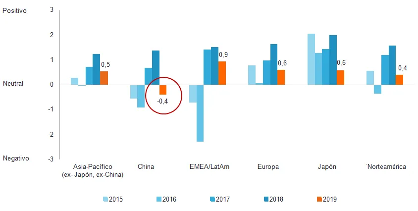 China es la única región donde la confianza ha caído a territorio negativo (-0,4). Nada menos que un 70% de los analistas de Fidelity que cubren empresas chinas espera que las rentabilidades sobre el capital desciendan en 2019, frente a tan solo el 29% en la encuesta del año pasado.