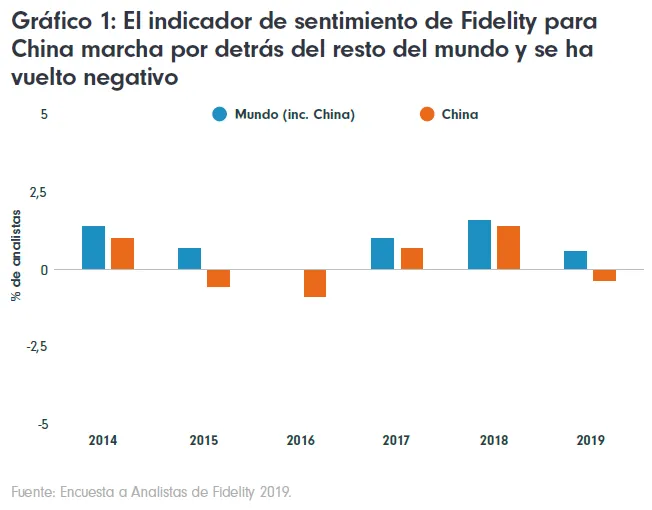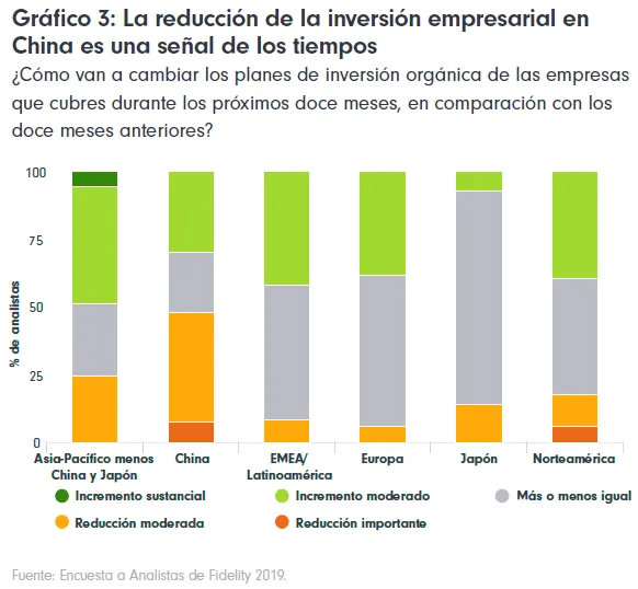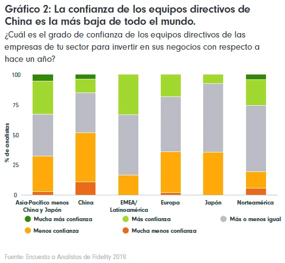 Veamos algunas de las principales conclusiones de la encuesta: de cara a 2019, nuestros analistas comentan que los equipos directivos de las empresas que cubren en China manifiestan menos confianza para invertir que en cualquier otra región del mundo; también se prevé que, en general, las empresas chinas sean las que registren las reducciones más importantes de la inversión, el número más reducido de ampliaciones de personal y la mayor proporción de incrementos previstos del apalancamiento.