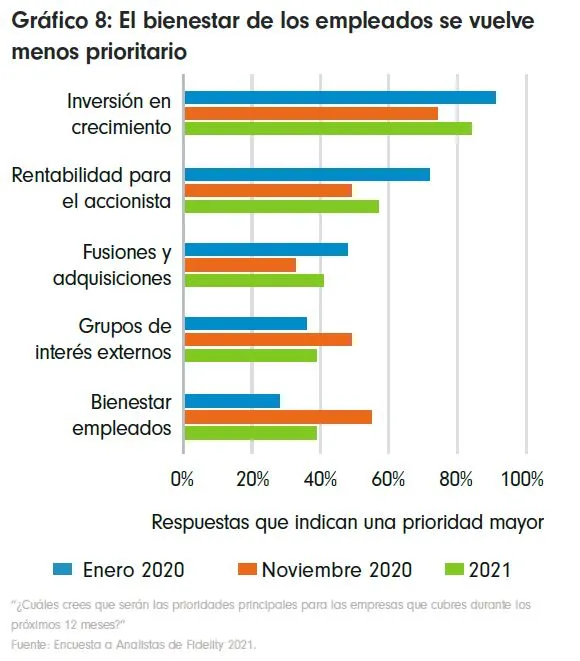 El año pasado ha traído consigo una profunda reconfiguración en muchos ámbitos, incluidas las empresas. A lo largo del mismo, hemos detectado variaciones en las prioridades de las compañías. En nuestra encuesta mensual de noviembre de 2020, pedimos a nuestros analistas que clasificaran las prioridades de las empresas que cubren y las compararan con las de enero de 2020. Sus respuestas revelaron que factores sociales como el bienestar de los empleados y de los grupos de interés externos habían cobrado mayor relevancia durante la pandemia.