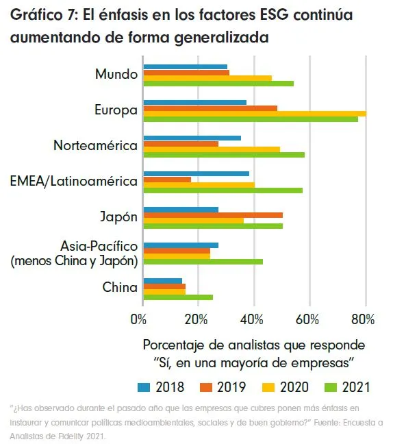 Las compañías europeas son actualmente las que van más adelantadas, ya que nuestros analistas calculan que un 30% de ellas serán neutrales en emisiones de carbono en 2030. Esto pone de manifiesto hasta qué punto la sostenibilidad está integrada en la región. Como ya sucediera en la Encuesta a Analistas del pasado año, Europa vuelve a contar con el mayor porcentaje de analistas que refiere un crecimiento en la actividad ESG en la mayoría de las compañías.