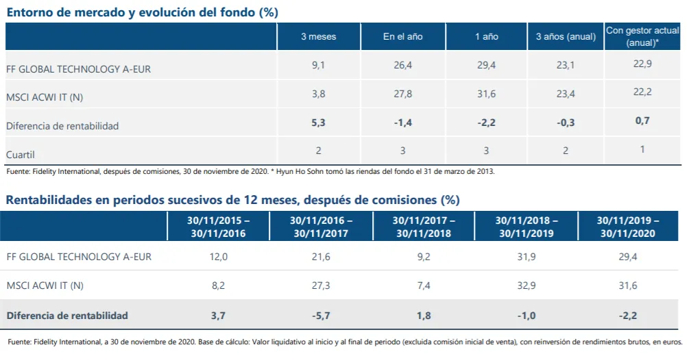 restricciones por la pandemia. Después de un 2020 espectacular para muchos negocios tecnológicos, las empresas se mostraron confiadas. Muchas de ellas se benefician de los renovados esfuerzos de digitalización por parte del sector empresarial en todo el mundo y los beneficios del sector tecnológico encuentran apoyo a largo plazo en las tendencias estructurales. Desde que Hyun Ho tomó las riendas, el fondo FF Global Technology Fund ha conseguido una rentabilidad anualizada después de comisiones del 22,9%, frente al 22,2% de su índice, el MSCI ACWI IT (N).