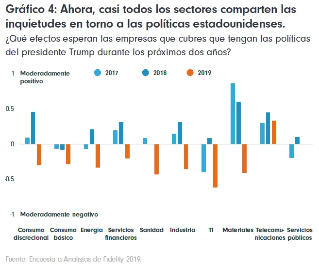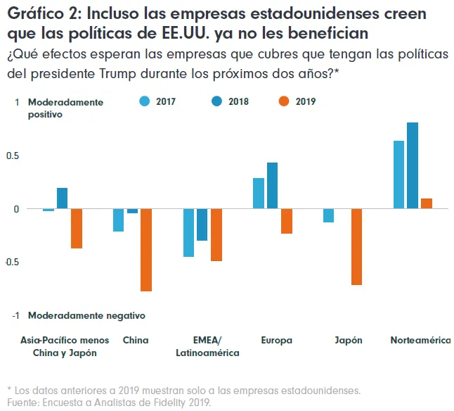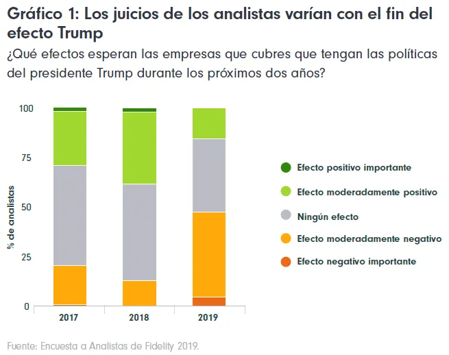 Continuamos repasando los resultados arrojados por nuestra Encuesta a Analistas de Fidelity 2019. Durante dos años seguidos, la Encuesta a Analistas puso de manifiesto un efecto moderadamente positivo de las políticas de Trump en las empresas de todo el mundo, alimentado por el optimismo de las compañías estadounidenses. Eso ha cambiado. Las dudas en torno a los planteamientos de la administración estadounidense están multiplicándose y ahora se prevé que el efecto neto sobre las empresas sea negativo.