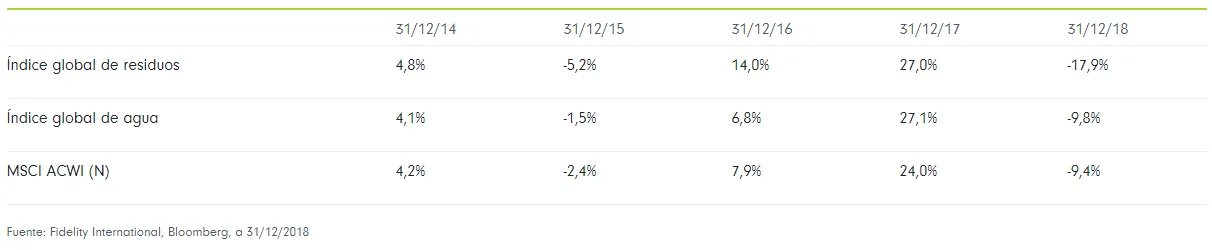 *Fuente: Fidelity International, Bloomberg, a 30 de Abril de 2019. Los residuos están representados por el índice BNP Paribas Waste (que batió al índice MSCI World en un 98% entre el 30 de septiembre de 2004 y el 30 de abril de 2019). El agua está representada por el índice S&P Water (que batió al índice MSCI World en un 117% entre el 30 de septiembre de 2004 y el 30 de abril de 2019).