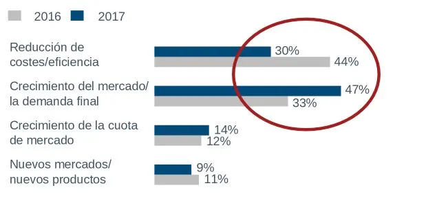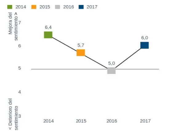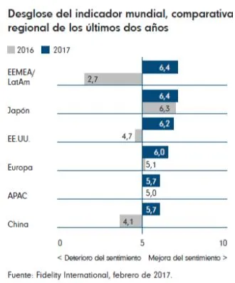 Los resultados muestran un entorno empresarial que apenas resulta reconocible comparado con 2016, y es que está marcado por una renovada confianza dentro de las empresas a pesar de la incertidumbre política en algunos mercados clave. Rebotando el indicador de sentimiento global hasta máximos de tres años.