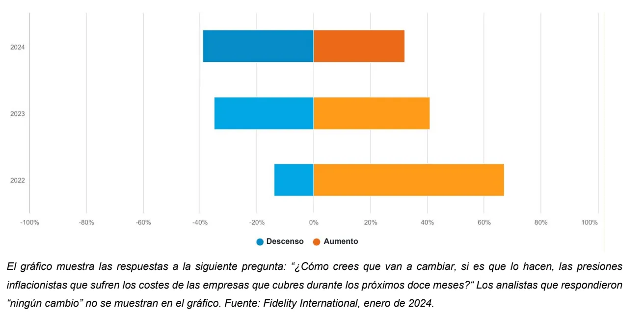 Gráfico 1: Por primera vez desde la pandemia, son mayoría los analistas de Fidelity que piensan que la inflación de los costes de la empresas descenderá durante el próximo año