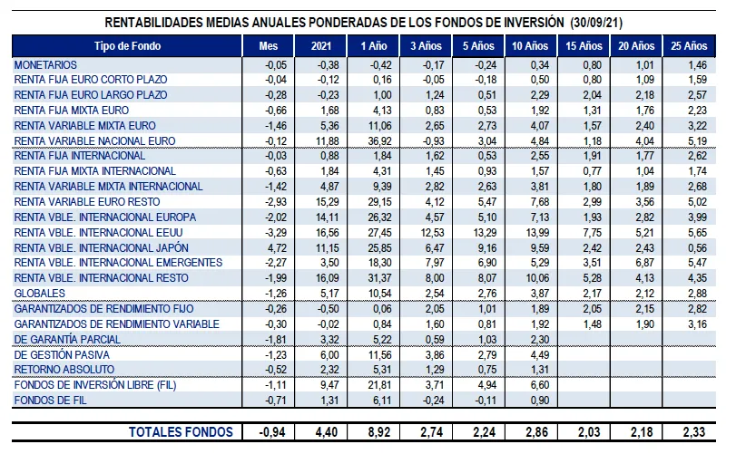 A pesar de que septiembre fue un mes negativo para muchos mercados, los inversores españoles siguieron mostrando su preferencia por los fondos de inversión como vía para rentabilizar sus ahorros. En el conjunto del mes, se registraron unas suscripciones netas (entradas menos salidas de dinero) de 2.217 millones de euros, según los datos de Inverco, la asociación del sector.