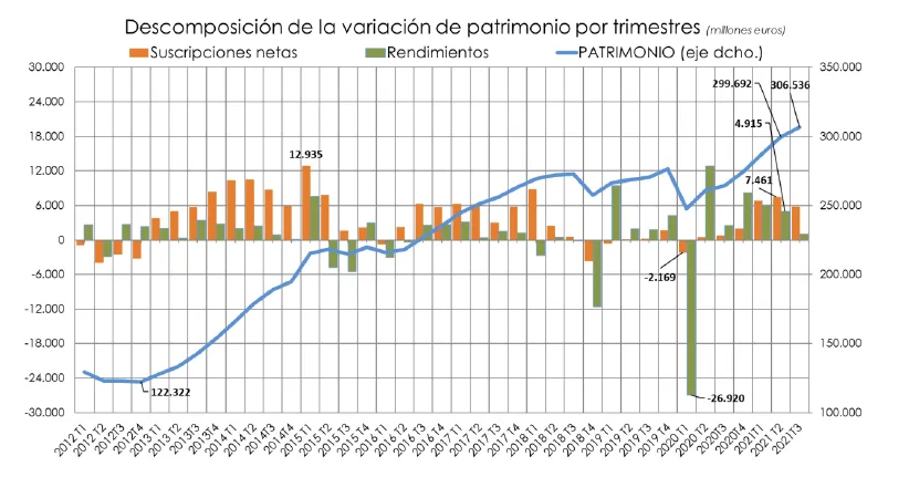 Con este nuevo incremento, la cifra de entradas netas en 2021 superan ya los 20.000 millones de euros y el patrimonio bajo gestión alcanza los 306.535 millones de euros, a pesar de que en septiembre esta cifra se redijo levemente por el comportamiento de los mercados.