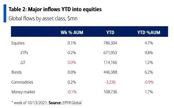 La renta variable sigue siendo el objeto de deseo de los inversores este 2021, pero la pasión pierde fuerza. Según los últimos datos de flujos a nivel mundial de EPFR, que recoge Bank of America en su informe semanal The Flow Show, en la última semana habrían entrado 11.600 millones en productos de inversión colectiva de renta variable, lo que eleva la cifra del total del año hasta 786.304 millones de dólares, un nuevo récord histórico.