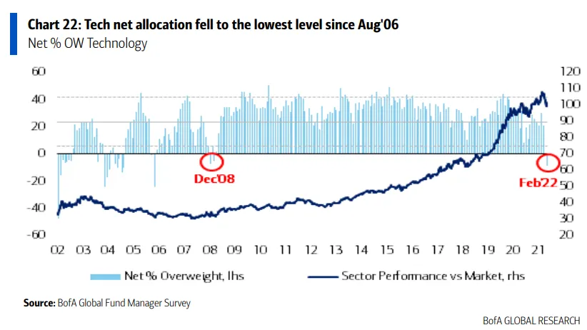 Los gestores reducen su exposición al sector tecnológico a mínimos de 2008 (enero de 2022)