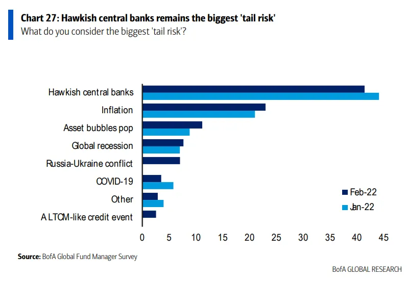 Las preocupaciones sobre la política monetaria eclipsan a otros riesgos sobre los mercados financieros, como la inflación o la pandemia. El 41% de los gestores señala a una línea agresiva por parte de los bancos centrales como el principal problema. En segundo lugar se sitúa la inflación, al ser apuntada por el 23% de los encuestados.