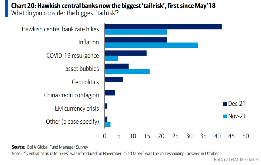 Bank of America ha presentado los resultados de su última encuesta global de gestores de fondos, correspondiente a diciembre de 2021. Un total de 330 gestores —que controlan un patrimonio de 968.000 millones de dólares— han participado en este sondeo. Hay una novedad destacada frente al sentimiento de los gestores en las últimas encuestas: una subida de tipos de interés acelerada por parte de los bancos centrales se ha convertido en el mayor riesgo para las Bolsas en 2022.