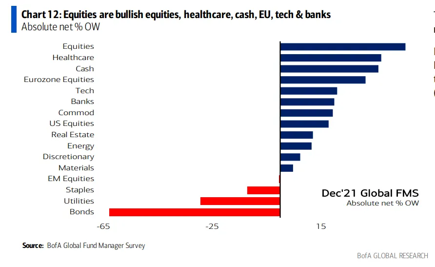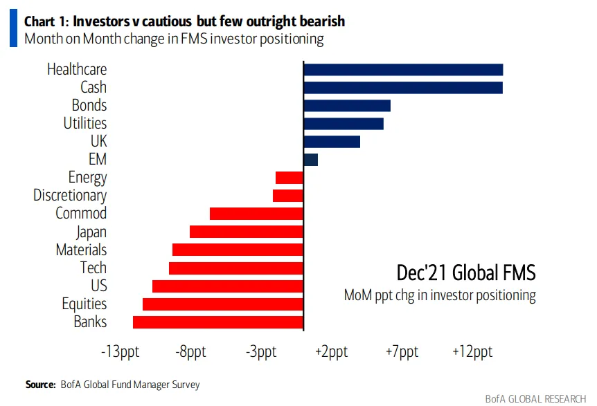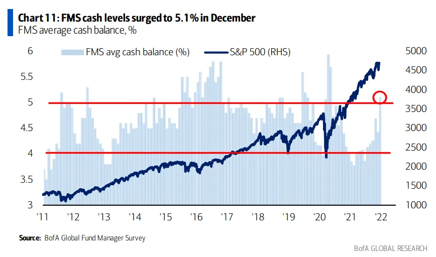 A pesar del optimismo, los inversores han aumentado la liquidez en cartera. Los niveles de efectivo han pasado del 4,4% en noviembre al 5,1% en diciembre, una subida del 36%. Se trata de la mayor sobreponderación de este tipo de activo desde mayo de 2020. La explicación para este incremento de la liquidez reside en la creencia de que los bancos centrales subirán los tipos.