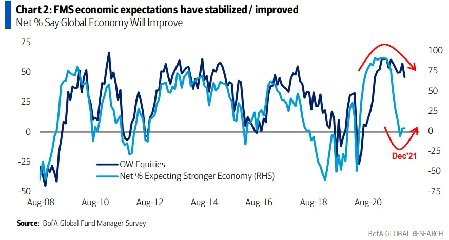 A pesar de estos temores, los gestores se han mantenido optimistas en relación con la evolución de la economía global. Las expectativas de crecimiento mundial se han mantenido en el 4% en la encuesta de diciembre, en el mismo nivel que el mes pasado, frente a la caída del 6% de octubre. Solo 6 de cada 100 inversores creen que habrá una recesión en los próximos 12 meses.