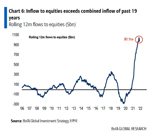 De hecho, el optimismo hasta ahora ha sido histórico. En el conjunto del año habrían entrado en fondos de renta variable casi 893.000 millones de dólares, un auténtico récord histórico que deja en nada los anteriores. De hecho, esta cifra supera el acumulado de los 19 años previos. Ahí es nada. Si cojemos los últimos 12 meses, en vez del año natural, la cifra de entradas habría superado el billón de dólares.